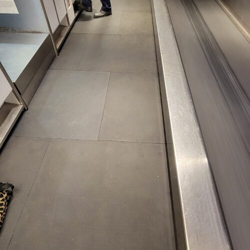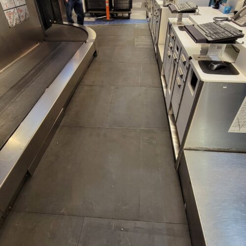 In September 2022, SmartCells installers completed the installation of several baggage drop-off areas for American Airlines at the Portland (PDX) airport. Previously airline workers were working directly on the floor with standing mats scattered around the area. Smartcells installed custom black flooring that was seamlessly fit around the curvature of the baggage carousel, desks, and fixtures around the work area.